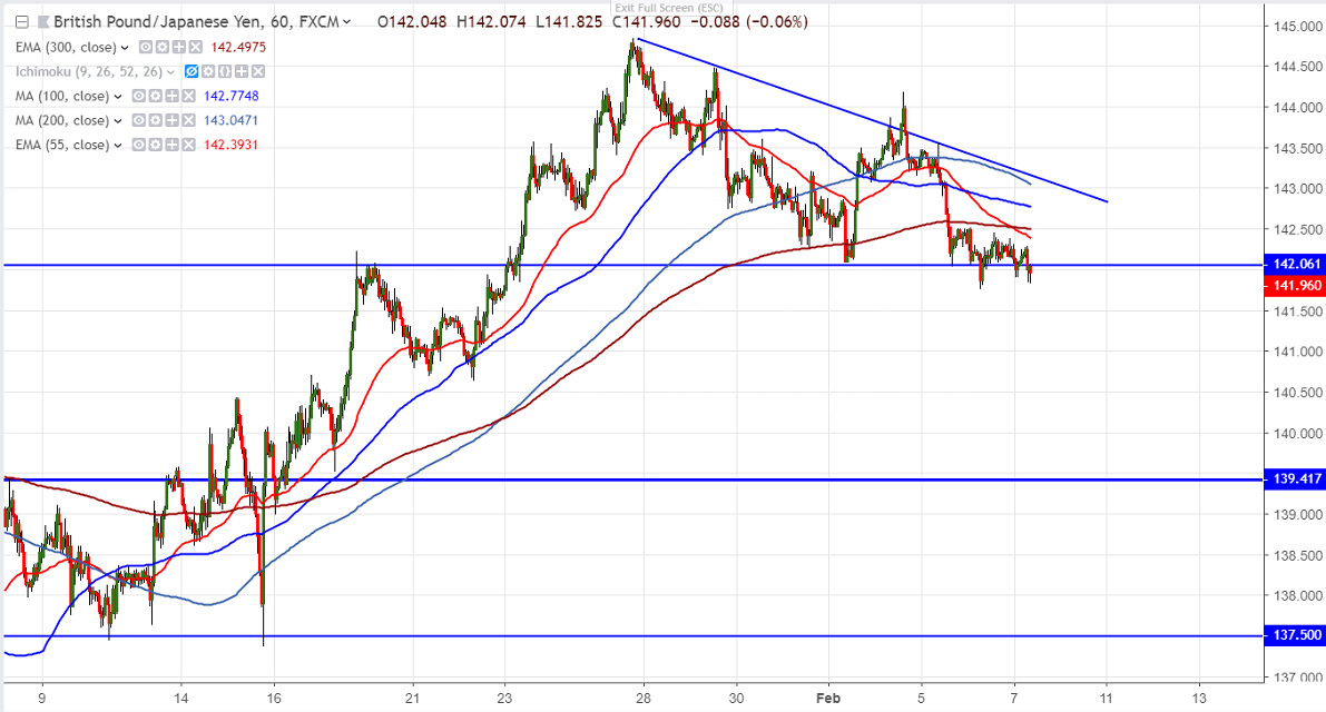 Intraday trend is still weak as long as resistance 142.56-60 (300- H EMA) holds. Any break below 141.80 will drag the pair down till 141.17/140.30. Any break below 140 confirms further bearishness.