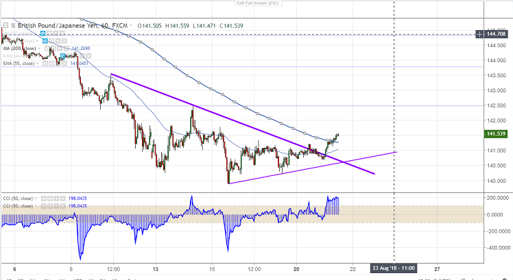 GBPJPY is recovering after a long consolidation. The pair hits low of 140.67 and once again jumped more than 80 pips from that level. The pair has broken high of 141.32 made on Aug 16th and slightly trading above 200 H MA. It is currently trading around 141.57.