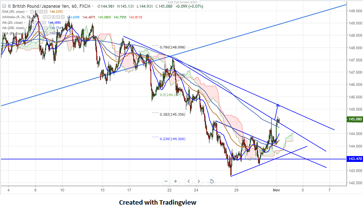 GBPJPY trades higher and jumped more than 100 pips yesterday on Brexit deal hopes. GBP was trading higher against all pairs especially USD and jumped more than 150 pips after Times of London reported UK and EU negotiators have reached an agreement. The pair hits high of 145.19 and is currently trading around 145.11.