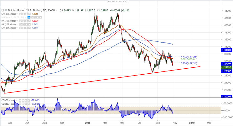 GBPUSD lost more than 100 pips yesterday on broad based US dollar buying. The pair hits low of 1.28675 and shown a minor recovery. The Brexit uncertainty remains major factor for Cable decline. Brexit deal is getting delayed due to Irish border issue and customs arrangement. It is currently trading around 1.28991.