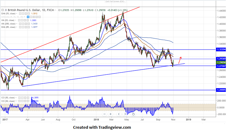 GBPUSD recovered sharply nearly 200 pips from low of 1.2695 made on Oct 30th 2018 on account of positive Brexit news. The pair hits high of 1.28835 and is currently trading around 1.28750.