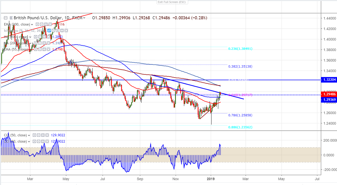 GBPUSD has declined nearly 50 pips after release of UK retail sales. UK retail sales declines 0.9% in the month of Dec compared to forecast of -0.8% and core retail sales dropped by 1.3%. The pair shown a good jump of more than 100 pips after UK PM Theresa May won no confidence vote in narrow margin 325 votes to 306 votes. The voting on UK PM May Brexit plan B and amendments to the motion will take place on Jan 29th. According to YouGov poll shows that support for UK to remain in the EU has increased to 56% versus 44% leave. The pair hits intraday high of 1.29935 and is currently trading around 1.29454.