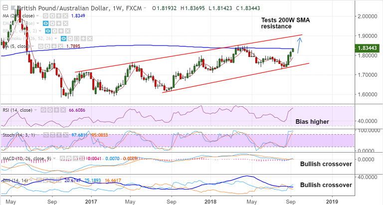- The pair is testing stiff resistance at 200W SMA at 1.8348, break above will see further upside. Scope then for test of 1.90 (channel top).