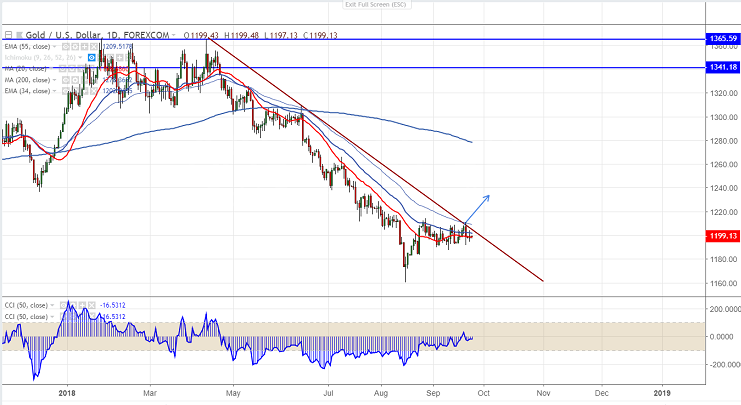 US 10 year yield : US 10 year yield is trading slightly higher after breaking high of 3.095% made on Sep 20th 2018.It is currently trading near high. Any break above 3.129% confirms further bullishness. Slightly negative for Gold.