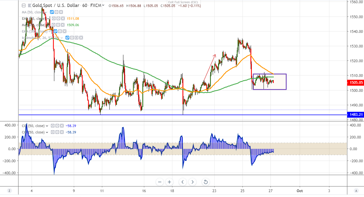 Gold is trading in a narrow range between $1500 and $1512 yesterday. With no major economic data markets eye US-China trade talk progress for further movement in the yellow metal. US Q2 GDP growth came at 2% annualized compared to 3.1% in Q1. The initial jobless claims rose by 3k to 213k slightly better than the forecast of 212k. The short-term trend is still bullish as long as support $1480 holds.