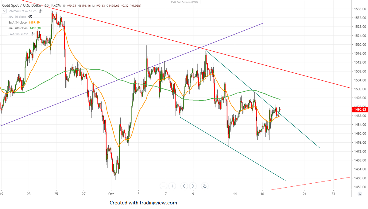 Gold has shown a good recovery of nearly $20 from low of $1475 due to weak US economic data. US retail sales have declined for the first time in 7 months and came at -0.3% compared to an estimate of 0.3%. This has increased hopes of a further rate cut by the Fed. It hits a high of $1493 and is currently trading around $1490.85.