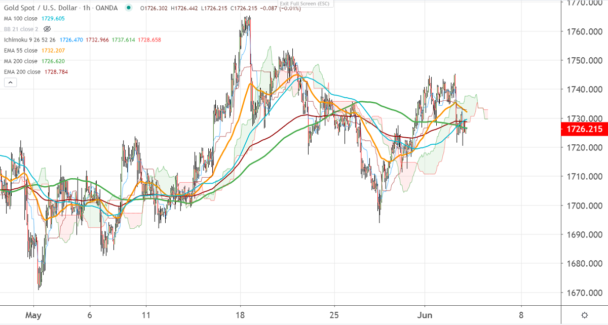 The yellow metal declined more than $20 from a high of $1744. In the hourly chart, it is holding below 200-H MA. This confirms intraday bearishness, dip till $1700/$1690 likely.