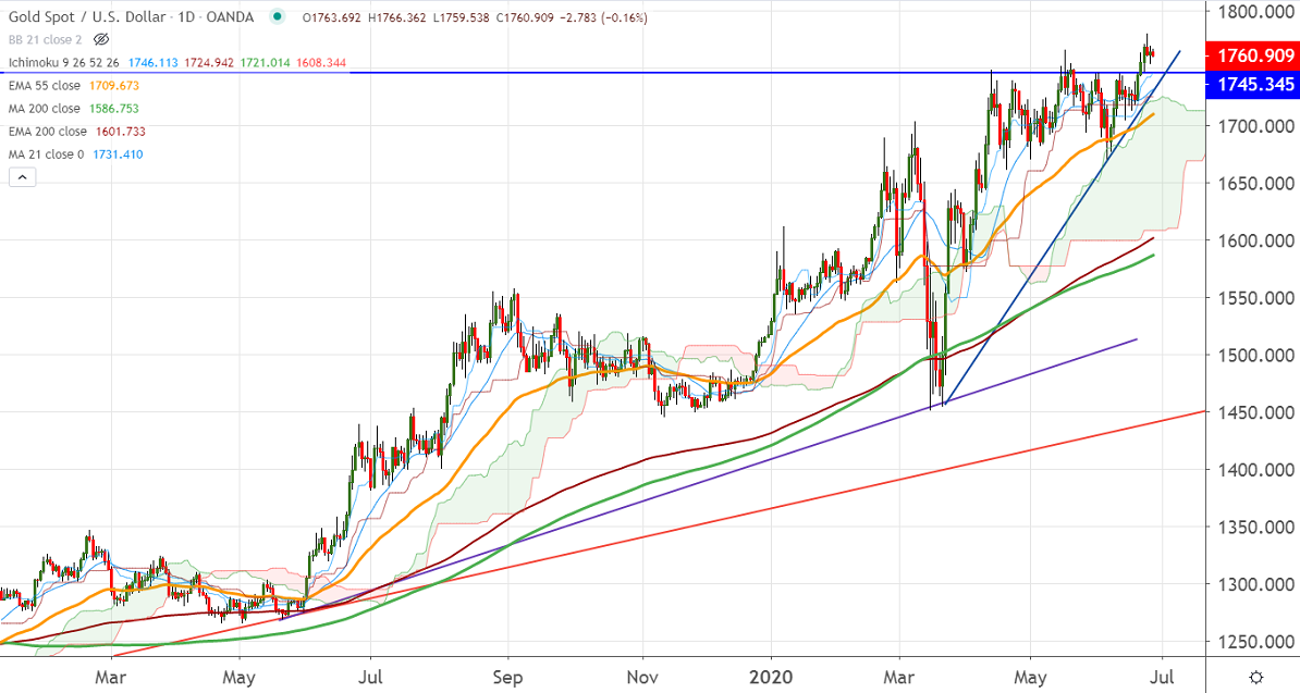 Gold is trading slightly lower after hitting 8- year high at $1779. The minor sell-off was due to strength in the US dollar. The fear of the second wave of coronavirus and positive economic data is supporting the US dollar.