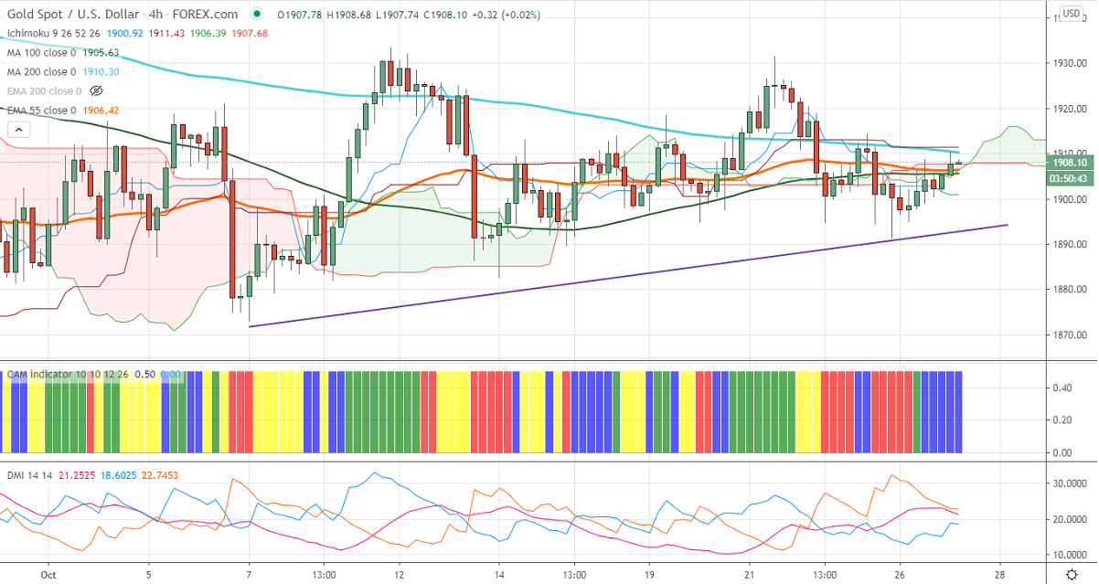 Gold has shown a minor recovery from a low of $1891. The increase in the number of new coronavirus cases in the US and Europe has increased demand for Safe-haven assets. The number of people hospitalized in the US is at a 2-month high. The US dollar index has once again declined after showing a minor jump above 93. Any violation above 93.13 (55-4H EMA) confirms bullish continuation. The US 10-year yield declined nearly 6% after hitting a 4-month high at 0.872%.