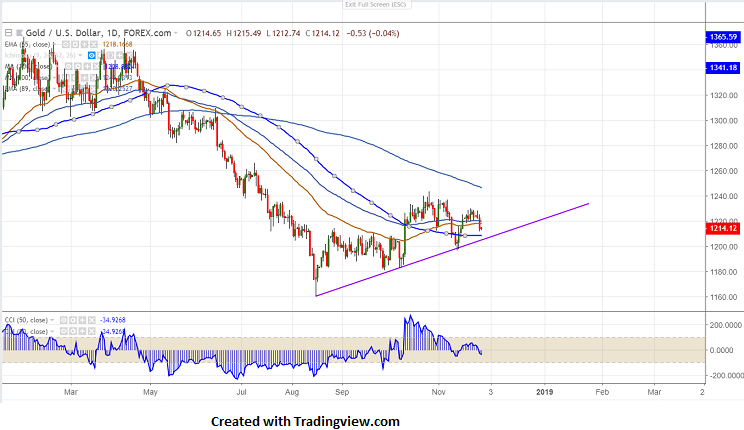 Gold trades lower and lost more than $10 yesterday on account of strong US dollar. The yellow metal hits low of $1211.98 and is currently trading around $1213.43.