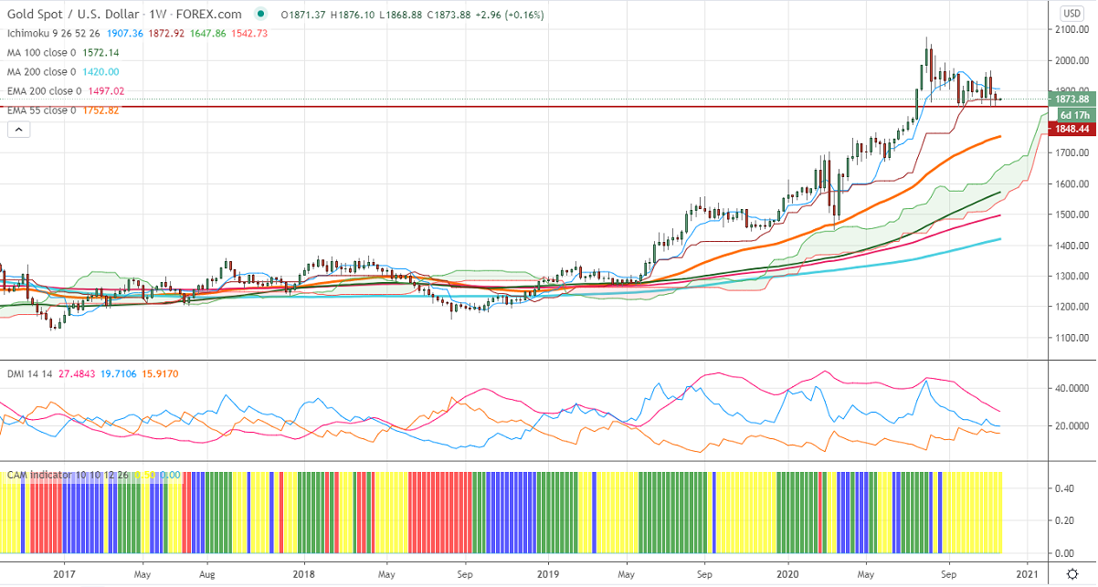 Gold has once again taken support near $1850 and shown a minor jump. The highlights of this week are a surge in daily coronavirus cases in the US to a record high. The hopes of the virus vaccine are putting pressure on the yellow metal at higher levels. The dollar index upside capped by 200- day EMA, any violation above 93.20 confirms further bullishness. The US 10-year yield declined more than 10%after hitting a multi-month high.
