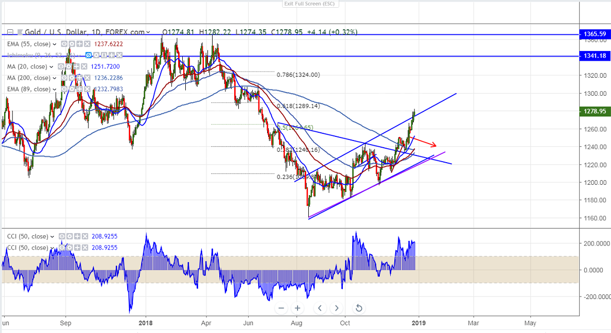 Gold is trading higher for past 7 days and jumped more than $30 on account of global stock market turmoil. It is currently trading around $1278.