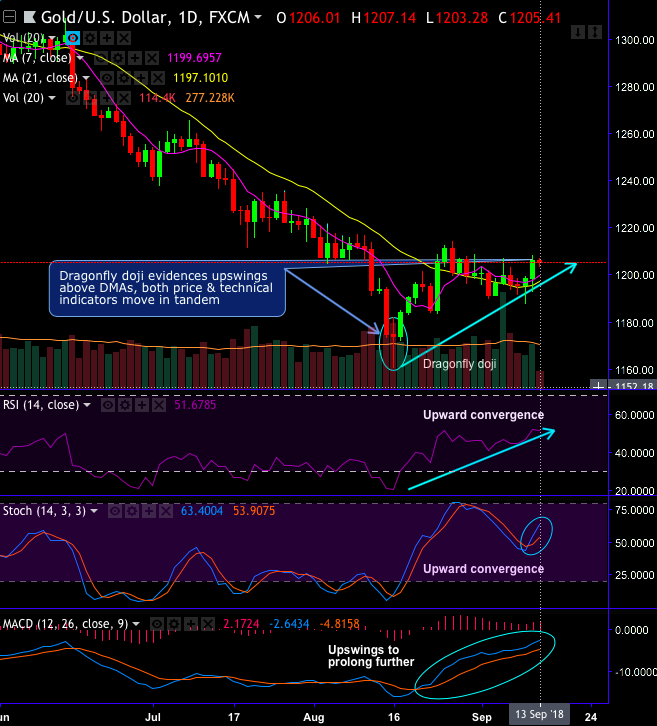 Gold (XAUUSD price) formed “dragonfly doji” at $1173.92 levels, ever since then bulls have been evidencing considerable upswings above 7 and 21-DMAs, while both price and technical indicators move in tandem (refer daily chart).