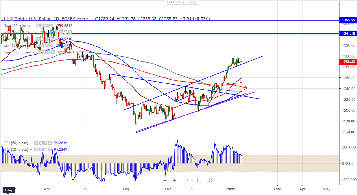 Gold is trading in narrow range between $1298 and $1276 for past 10 days. The yellow metal recovered nearly $75in the month of Dec on account of dovish Fed and broad based US dollar weakness. It is currently trading around $1289.