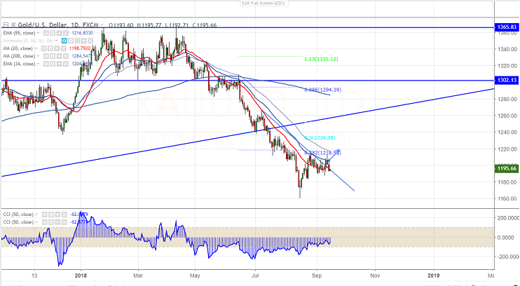 The yellow metal has lost nearly $20 high of $1212.72 and it is currently trading around $1195 The trend is slightly bullish as long as support $1192 holds.