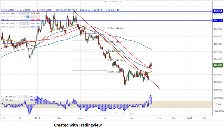 The near term support is around $1217 (89- day EMA) and any violation below will drag the commodity down till $1211/$1204.