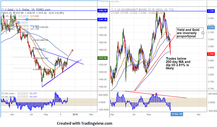 Gold trades higher for second consecutive day.and jumped more than $15 from low of $1221.50 made yesterday on account of easing bond yield and minor weakness in US dollar.It is currently trading around $1236.88.