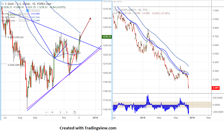 Gold has shown a minor jump of nearly $8 yesterday on declining US 10 year yield. It is currently trading around $1239.01.