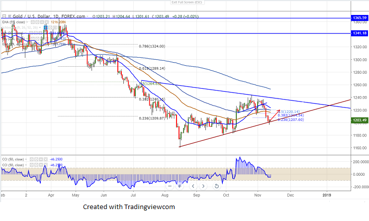 The yellow metal shown a dead cat bounce after showing a minor decline below trend line. On the higher side, major resistance is around $1207 (23.6% fib) and any break above $1207 will take the commodity till $1216.50/$1227/$1236 .It should break above $1243 (Oct 26th 2018 high) for bullish continuation.