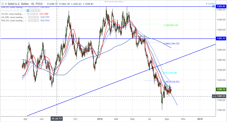 The yellow metal is consolidating in narrow range and it is currently trading around $1200. The trend is slightly bullish as long as support $1192 holds.