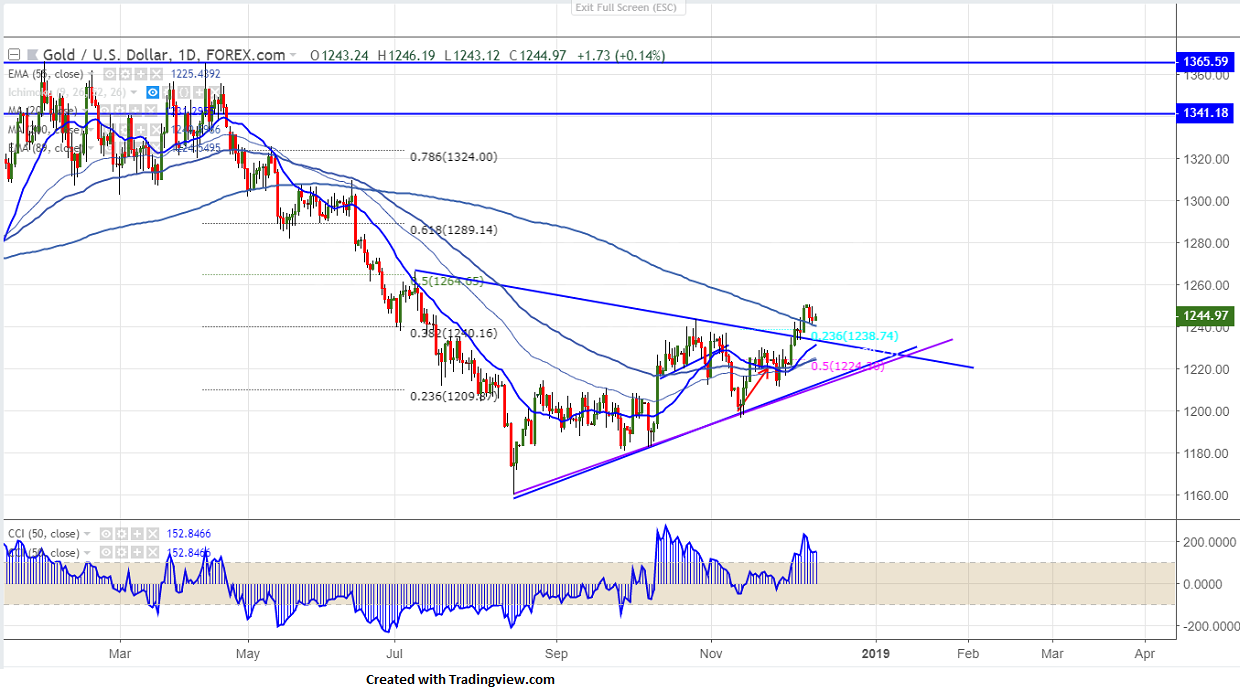 The near term support is around $1238-41 (23.6% fib and 200-day MA) and any violation below will drag the commodity down till $1229 (10-day MA)/$1221 (55- day EMA).