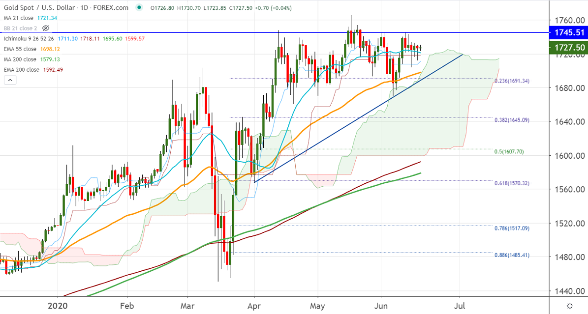 Gold trades flat between $1679 and $1745 for the past ten days. The increase in risk aversion due to the second wave of coronavirus outbreak in the U.S and China. The number of new cases hits record high in 6 states such as Arizona, Florida, Oklahoma, Oregon, and Texas.