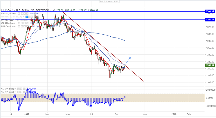 The yellow metal has jumped more than $10 and it is currently trading around $1209. The trend is slightly bullish as long as support $1192 holds.