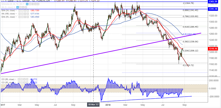 USDJPY: Trend slightly Bearish. The pair has support near 34- day EMA and recovered almost 50 pips from the low . Any break below 110.93 confirms further bearishness. The near term resistance is around 111.48 and any break above targets 112.15.Slightly positive for gold.