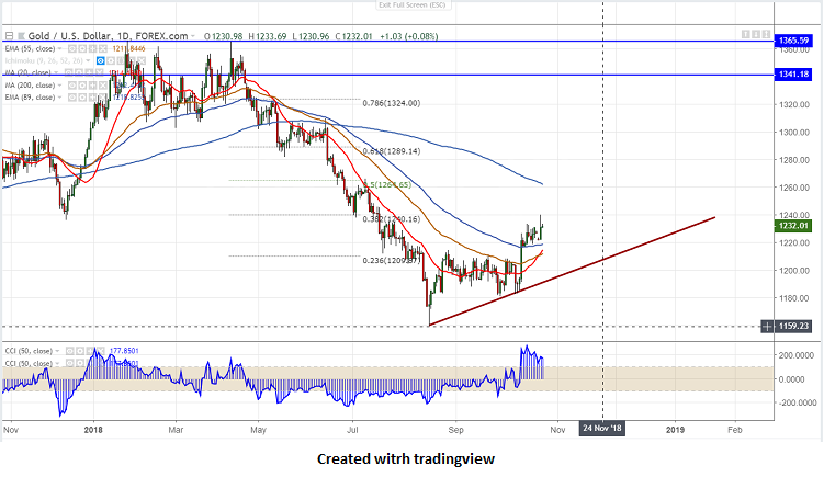 The near term support is around $1218 (89- day EMA) and any violation below will drag the commodity down till $1211/$1204.