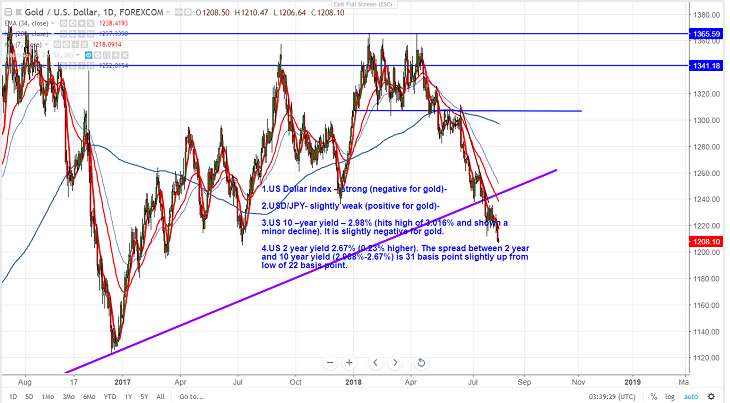 Gold has lost more than $15 in yesterday’s trading as US dollar index hits 2 week high. The yellow metal hits low of $1206.64 at the time of writing. The rising trade tensions and hawkish US Fed is supporting US dollar. Markets eye US Non farm payroll for further direction. It is currently trading around $1220.