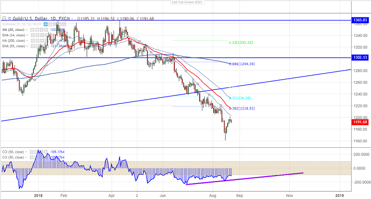 The yellow metal has shown a dip of $10 after showing a $40jump from the low of $1160. The slight jump in US dollar index after hawkish fed minutes meeting . DXY recovered more than 50 pips from the low of 94.93.Any close below 94.99 (50- day MA) confirms firther weakness. US bond yield was trading flat and investor eyes Jacksonhole symposium and US -China trade talks.it is currently trading around $1196.25.