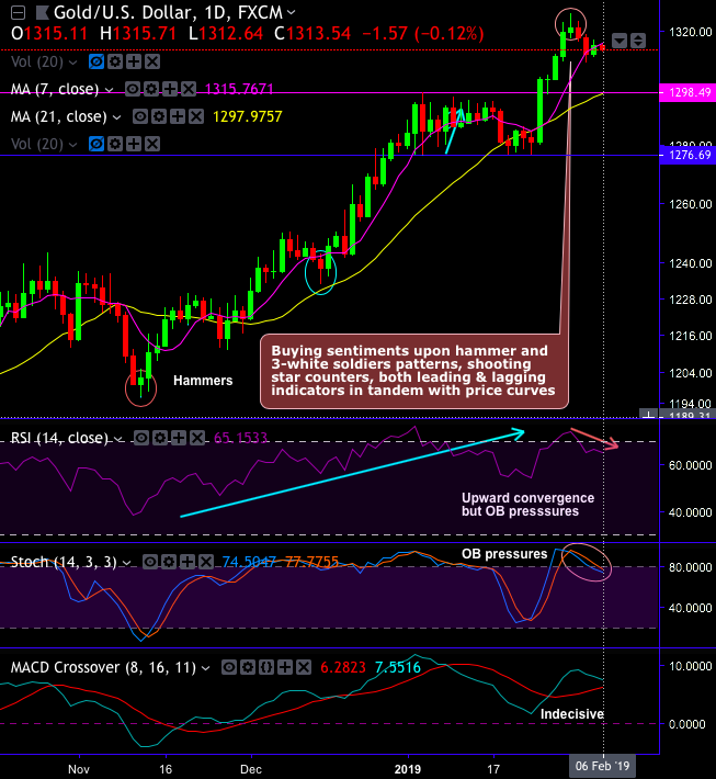 Technical glance: Gold (XAUUSD price) has continued to sense selling sentiments after shooting star formation at $1,321.23 levels, hammer patterns have occurred at $1,280.95 and $1,282.54 levels (on daily plotting). Consequently, bulls had taken-off rallies above DMAs.