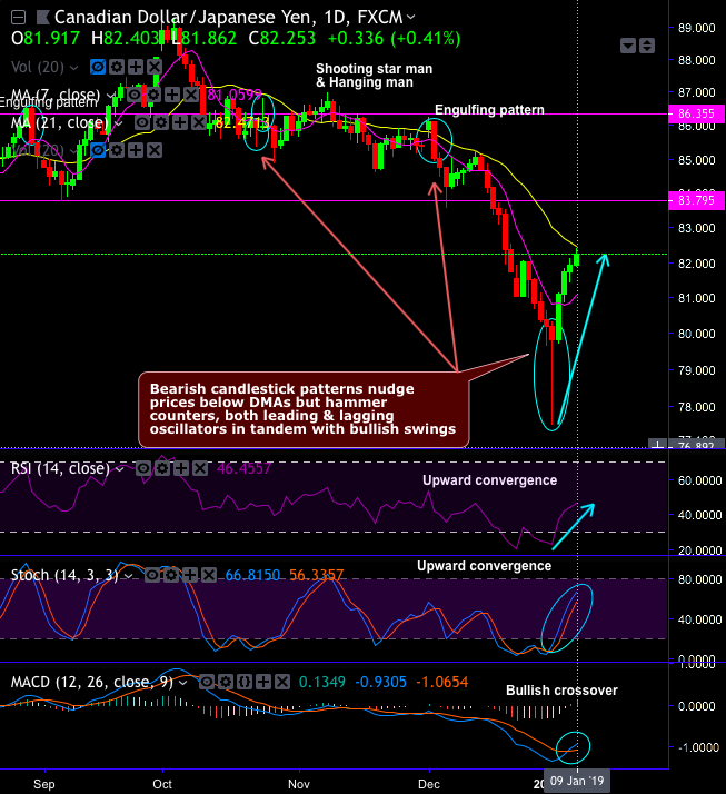 Take a Glance at Technical analysis: CADJPYforms bearish engulfing pattern at 85.025 and 81.741 levels on daily and weekly terms that nudges price towards DMAs and EMAs respectively. Ever since the formations of bearish engulfing and shooting star patterns at 85.025 and 87.851 levels on daily and weekly plotting, we witnessed steep slumps thereafter. But for now, bulls have countered with the hammer patterns at 79.823 and 81.113 on daily and weekly terms respectively, while both leading and lagging oscillators in tandem with bullish swings that indicates interim bullish momentum.