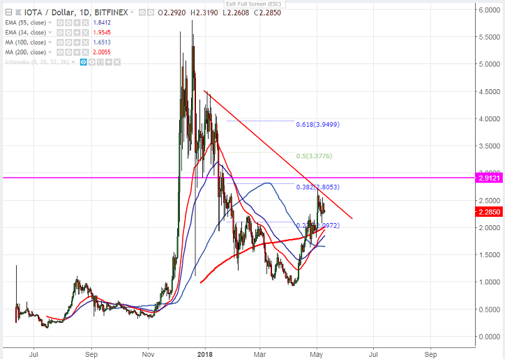 - The pair jumped almost more than 45% in the month of May. IOTA hits high of $2.69 and declined till $2.06 level. Short term trend is still bullish as long as support $1.97 (200- day MA) holds. Any break below $1.97 will drag the pair down till $1.82 (55- day EMA)/ $1.65 (100 – day MA).
