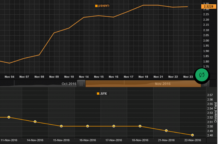 In the aftermath of the U.S. election result, bond yields surged to the same level of riskier S&P 500 dividend yields. Due to this, safe-haven investors can reap the same yields as they would have from riskier stocks.