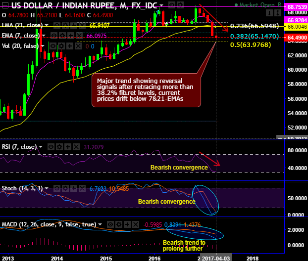 On a broader perspective, USDINR breaks out below 65.1470 (38.2% Fibonacci retracement levels) has indicated that more pullback is likely and bears are likely to resume their primary downtrend.