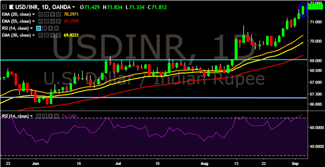 We prefer to take long position on USD/INR around 71.70, stop loss at 70.33 and target of 72.24/72.44.