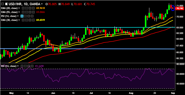 We prefer to take long position on USD/INR only above 70.85, stop loss at 70.47 and target of 71.24.