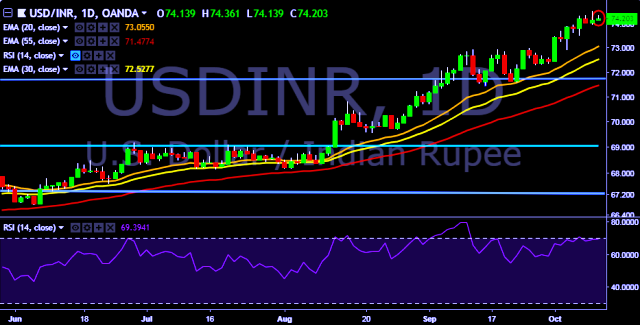 We prefer to take long position on USD/INR around 74.20, stop loss at 74.00 and target of 74.57.