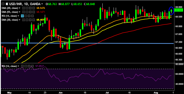 We prefer to take long position on USD/INR around 68.80, stop loss at 68.65 and target of 69.52.
