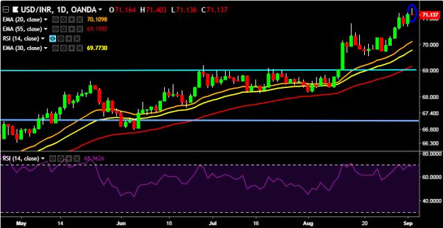 - USD/INR is currently trading around 71.14 marks.