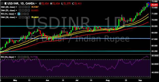 We prefer to take long position on USD/INR only above 72.65, stop loss at 72.20 and target of 73.02.
