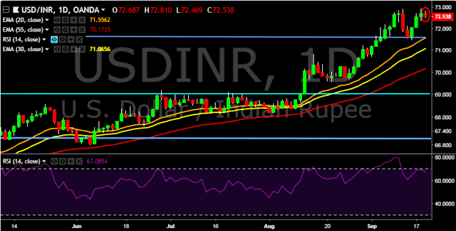 We prefer to take short position on USD/INR around 72.55, stop loss at 72.85 and target of 72.03.