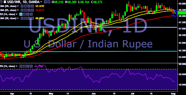 We prefer to take short position on USD/INR only below 67.98, stop loss at 68.52 and target of 67.59.