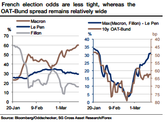 But there is now some risk premium in the bond market since Macron’s odds rose while the OAT-Bund spread did not materially tighten.
