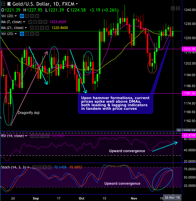 Technically, Gold (XAUUSD price), formed “hammer patterns” at $1,201.95 and $1,200.55 levels on daily and monthly plotting respectively. Consequently, bulls, have attempted to spike above DMAs,on the contrary, but technical indicators on the monthly terms, are in no conformity to these interim rallies. RSI and stochastic curves, on this timeframe, still converge downwards, while MACD is also bearish bias.