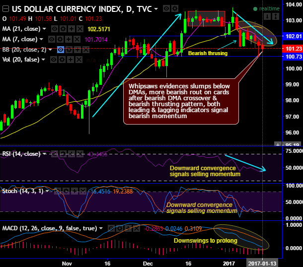 Technically, the whipsaws evidences slumps below DMAs, more bearish rout on cards after bearish DMA crossover & bearish thrusting pattern, both leading & lagging indicators signal bearish momentum (see daily chart).