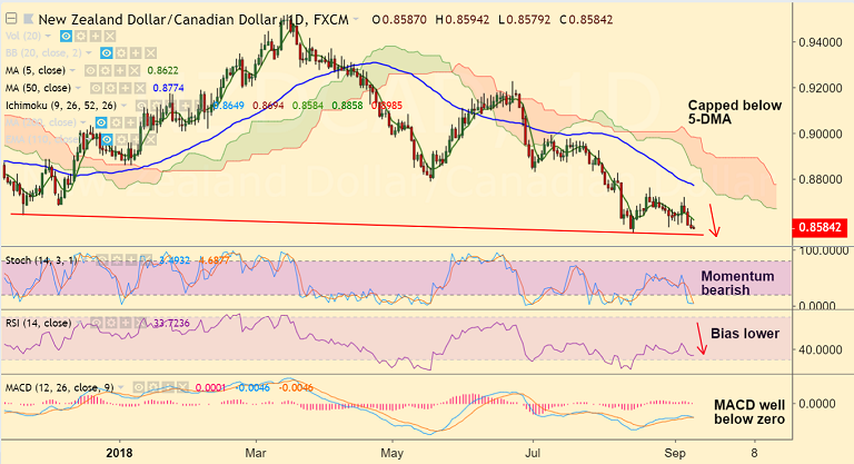 - Pair slips below 5-DMA, 5-DMA has turned south