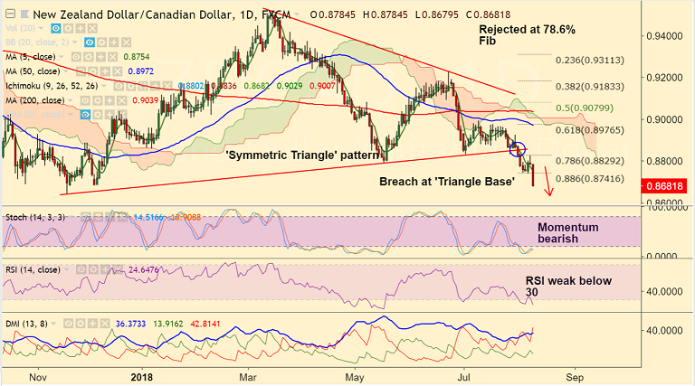 - Technical studies support further weakness in the pair. Breach of 'Symmetric Triangle' pattern adds to bearish bias.