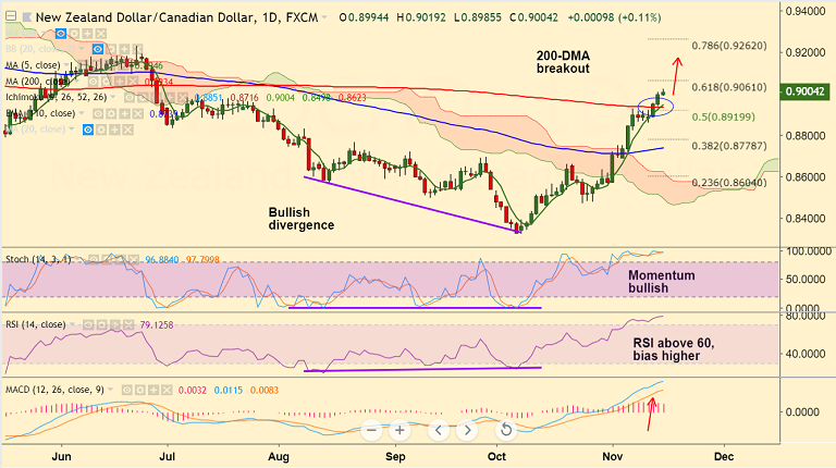 - NZD/CAD is hovering around 0.90 handle, trades 0.09% higher on the day.